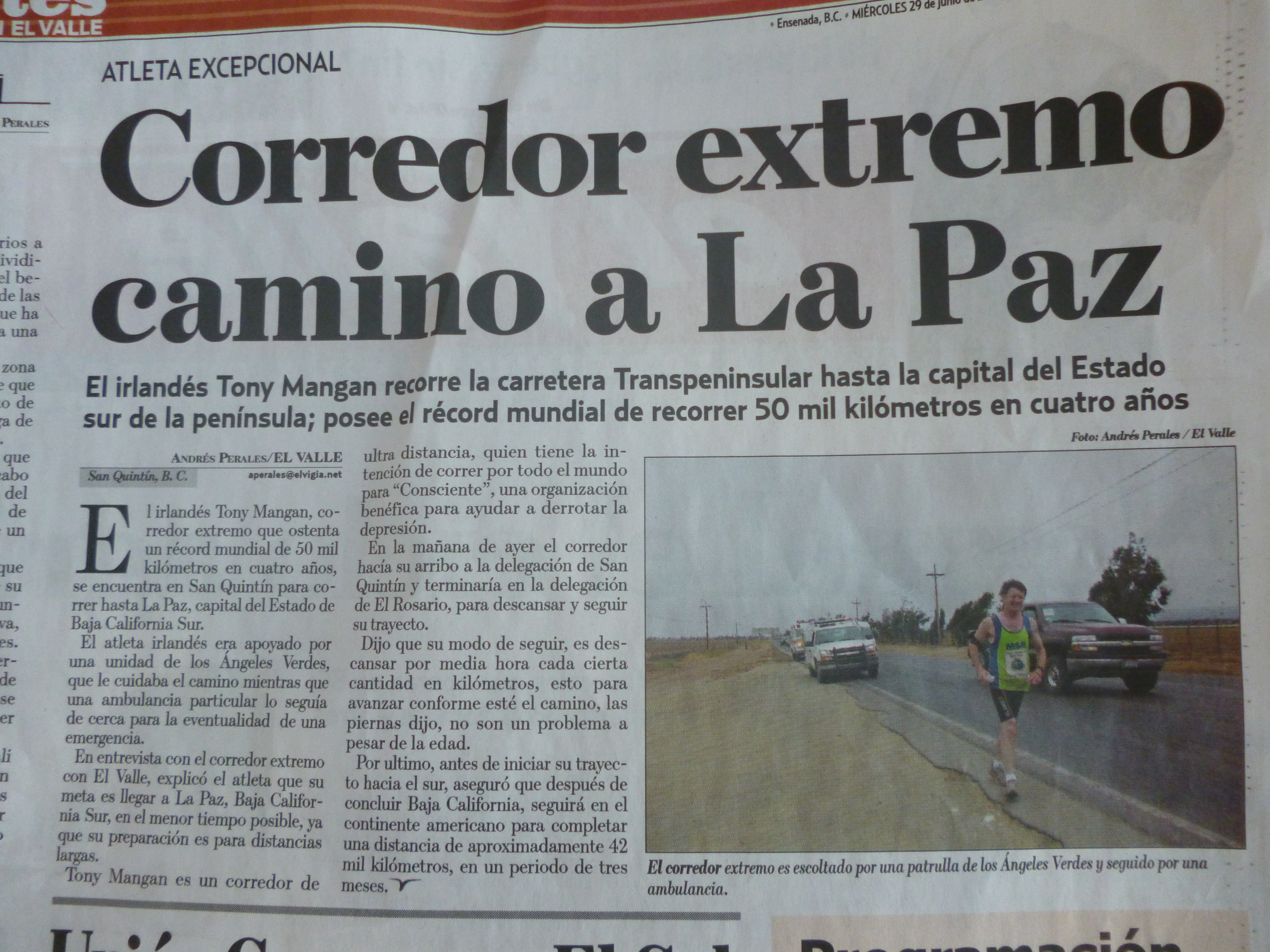 After an enjoyable 42km I ran into Punta Prieta and waiting outside the station for me was the editor of the peninsulas only newspaper, El Vigia. He had just driven over 500km from Ensenada with a photographer and a journalist! Three of them when surely one would have been enough! I told them how much I was enjoying myself, how good the police, Green Angels and the Mexican people are. A few other basics and the just upped and left after taking 2 pictures of me running holding a copy of El Vigia! I ran on another 14km and was joined by Jaime who followed in his Green Angels truck. I finished with almost 56km today and was driven back to my house again.
