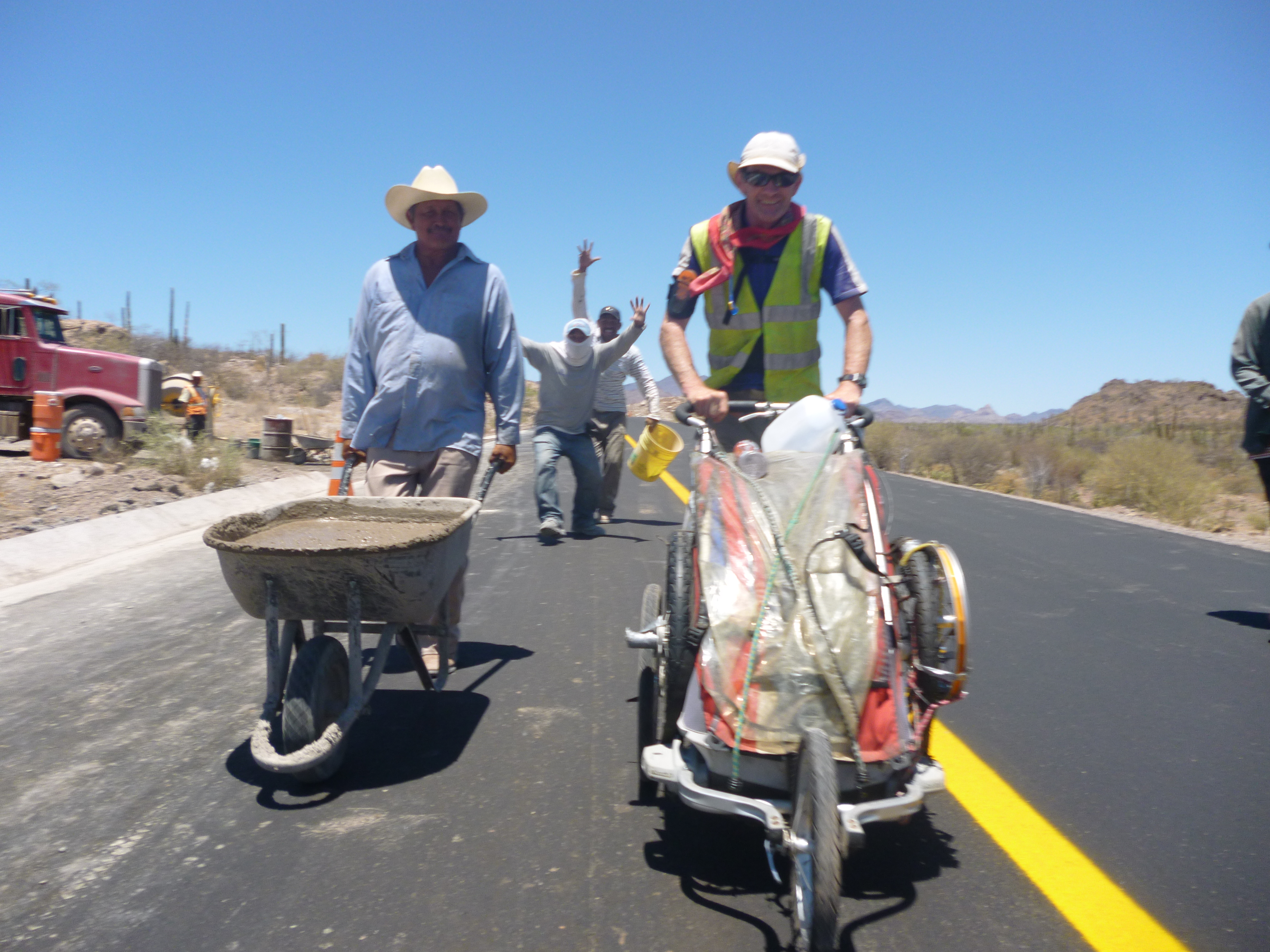 Last time I updated I was in Santa Rosalita, a busy copper mining town. I had been so busy I hadn’t eaten till 10pm as I had more or less spent the late afternoon and evening in an internet cafe. I had also been dropped there by a police officer, it was about 2km away from the station where I was spending the night and I didn’t even know my way back.That particular occasion I went into a restaurant where Derek the project manager for CAT heavy vehicles on the site warmly greeted me. Derek tells me he is from Tijuana, living close to the US border has enabled him to become fluent in English. This copper mining project is a huge boost to Santa Rosalina’s economy. Tonight he was out having dinner with about 8 of his senior workers. He added my dinner to his bill and drove me back home, so all ready for another early start  The ever increasing urgency to get early starts due to the daytime heat adds to the stress, something has to give and readers of this blog know that is almost always adequate rest and recovery time. This is the only part of running around the world I don’t like, the running on the road is fun but this is mostly an 18-20 hour day, day after day.So I am trying to keep up my nutrition getting as many meals as I can. My favorite meal here is carne asada, a very generous beef steak dinner, with all the beans, rice and salad for about $6 :)