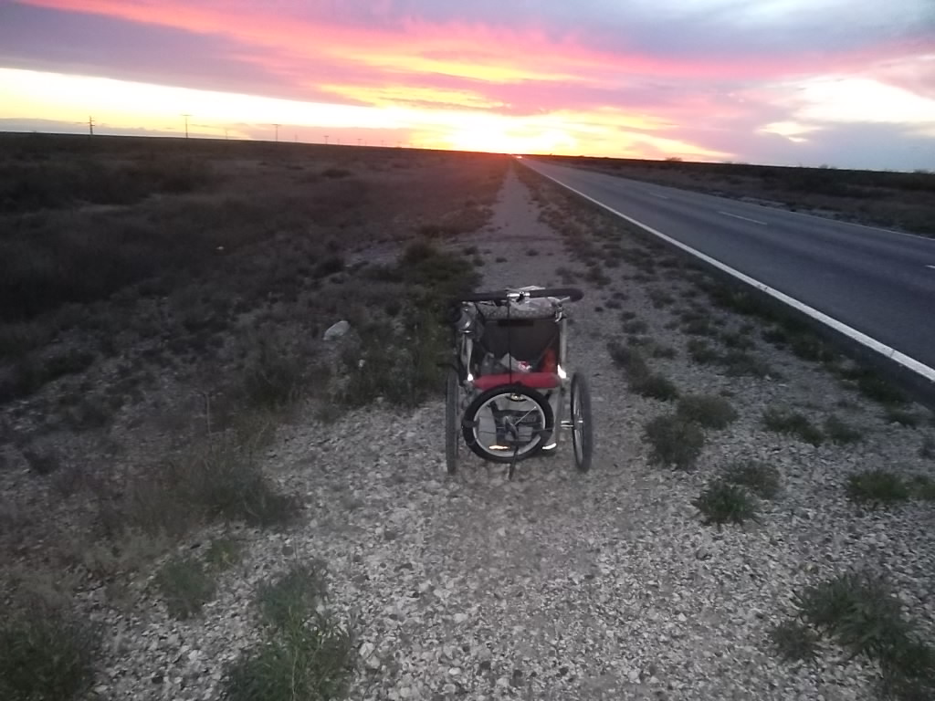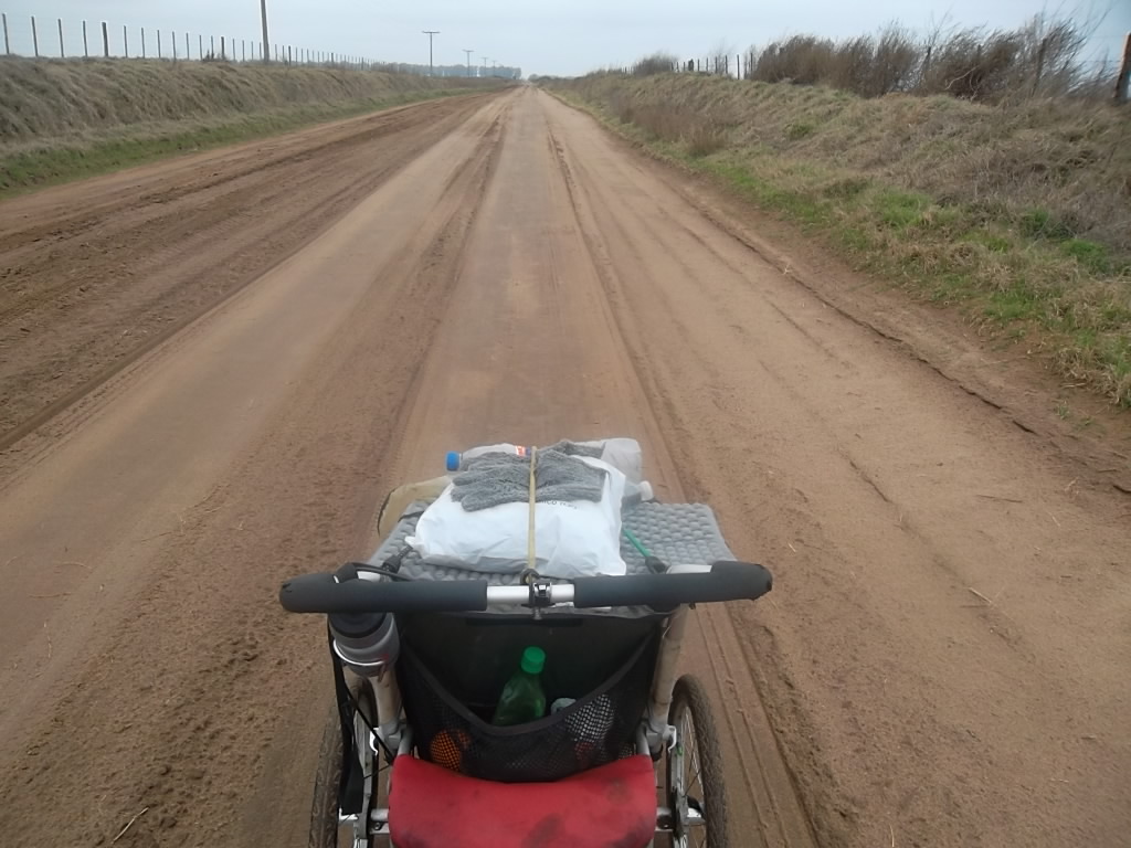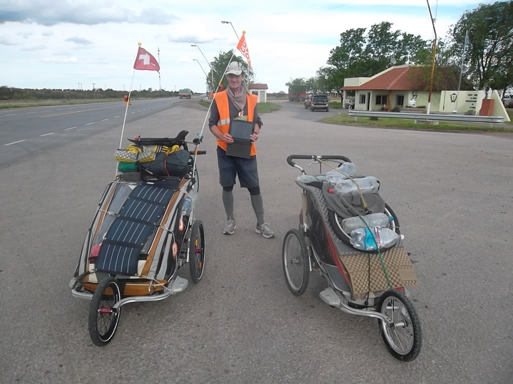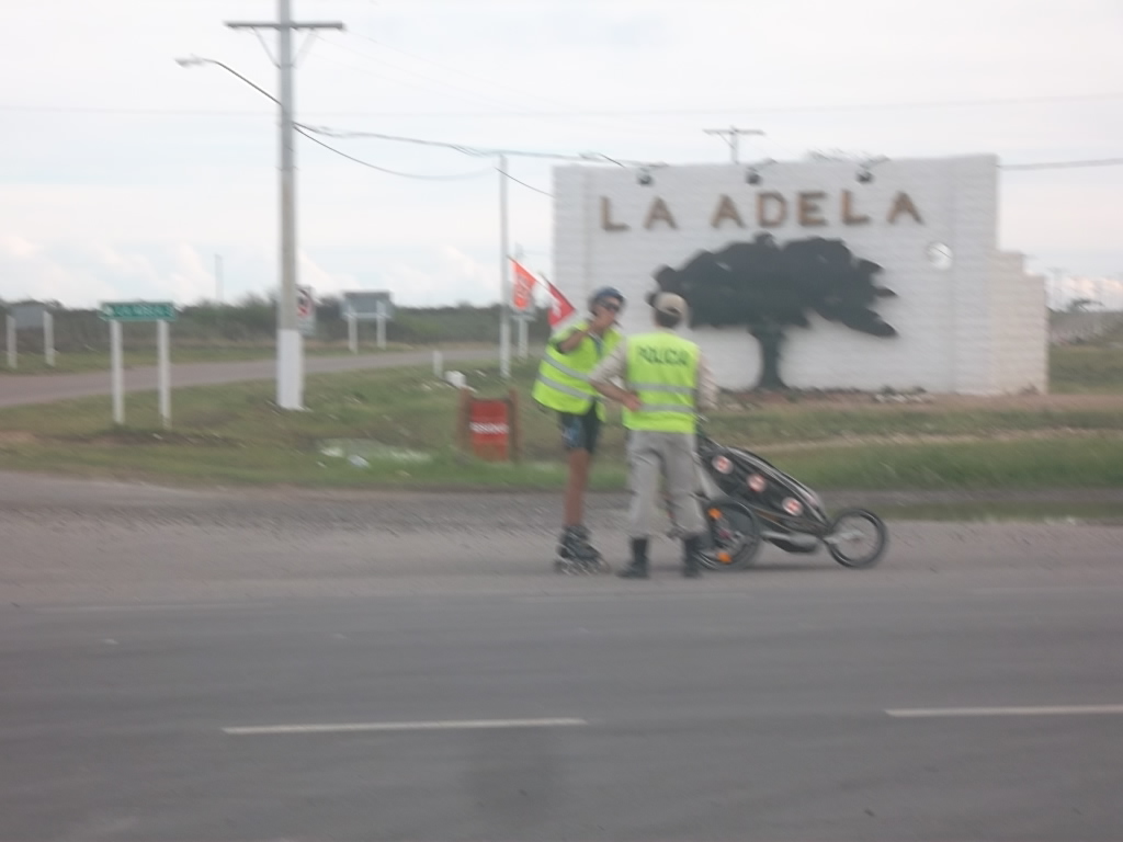 The run into Rio Colorado just over the Rio Negro line was pretty routine, even if I was just a bit tired. About 7km before rio Colorado and at a major junction in La Adela and in the distance I see of all things a man on roler blades pushing a Chariot Cheetah jogging stroller. Just like Nirvana but with a higher carrying capacity. He is being questioned just like me by a cop.
