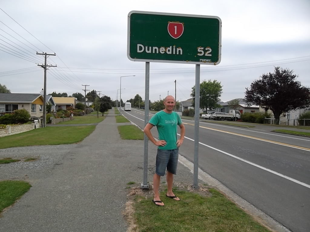 Sunday morning the owner of the tavern brought me out a bowl of cereal and coffee before I finally got going at 11am. I had a slow start before picking it up after my only stop that day for a monster ice cream in a supermarket in Hampden. The guy there just kept piling the ice cream up the cone, a triple scoop of course, goes without saying. It took me 20 happy minutes to eat. That kept me going till I clocked out for the day with 45k I finished in a small town called Palmerston where my host a tri-athlete called Andrew arrived at a conveniently placed finishing sign for the day.. Dunedin 52km sign was photographed, I would be dropped back here in the morning, a back track of about 14km.