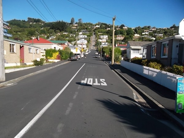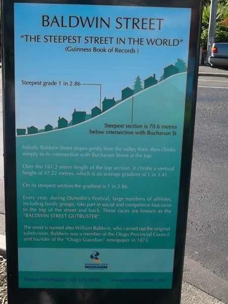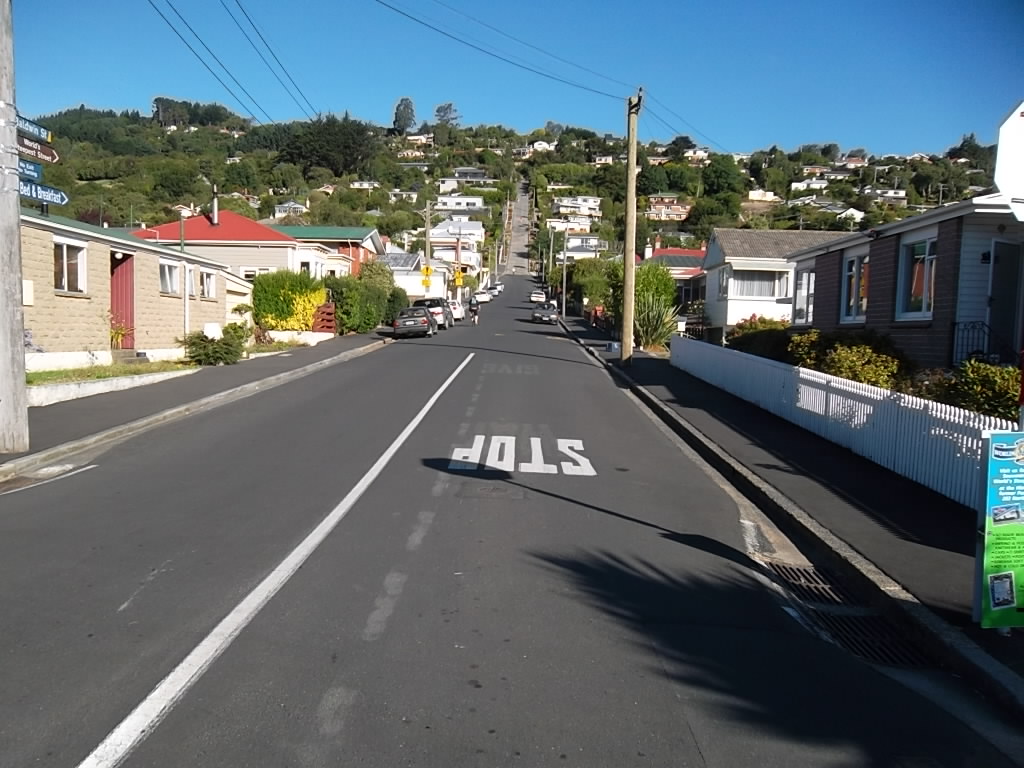 This was at km 54 of today’s 55, yes I ran by the foot of the ‘ worlds steepest street ‘ aka Baldwin Street. 161 metres long it has a 1 in 3.5 gradient and at it’s steepest section is a 1 in 2.5 gradient. During the towns festival there is a race up and down the hill called the ‘ gut buster ‘
