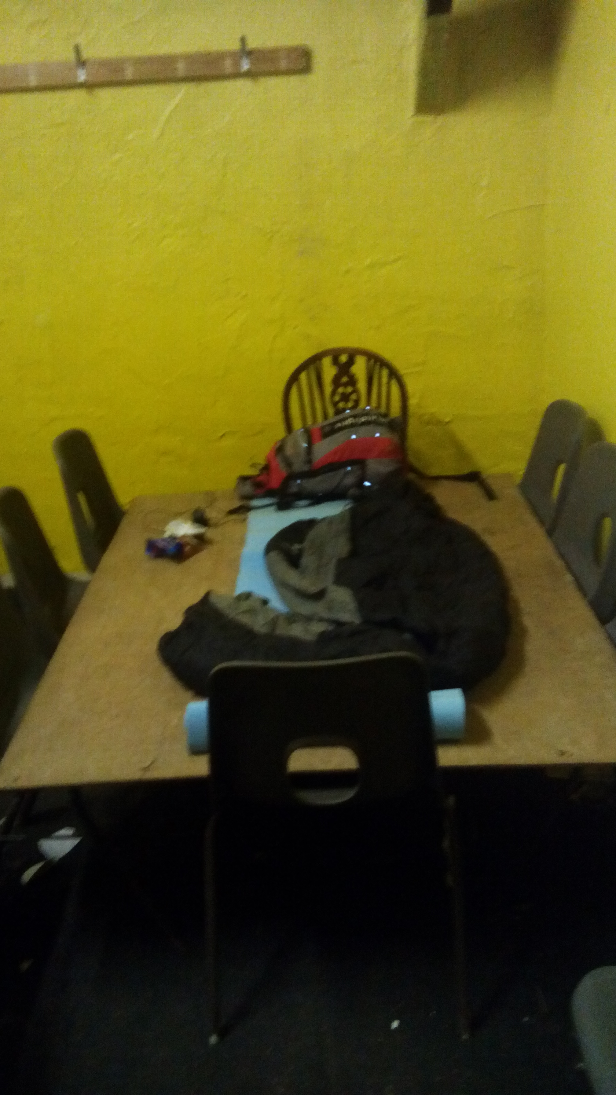 I pulled a piece of plywood which was lying behind a row of chairs, pulled a nail out and propped it up on eight chairs to make a bed.
